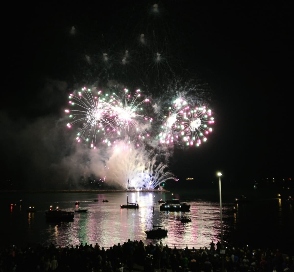 I sat on the grass bank and watched the explosions searing their presence on the darkness of the night sky above and reflecting in the glossy ink ripples of the sound below.