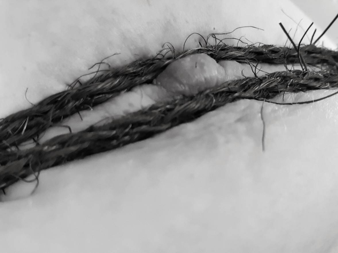 I first encountered this particular material at a rope munch, watching a scene between an amazing pairing. It was being used between her toes to add a different sensation to the already painfully tight bondage. Afterwards the bunny explained that it was so deliciously uncomfortable as crotch rope, which was why she wouldn’t be letting me try hers out!