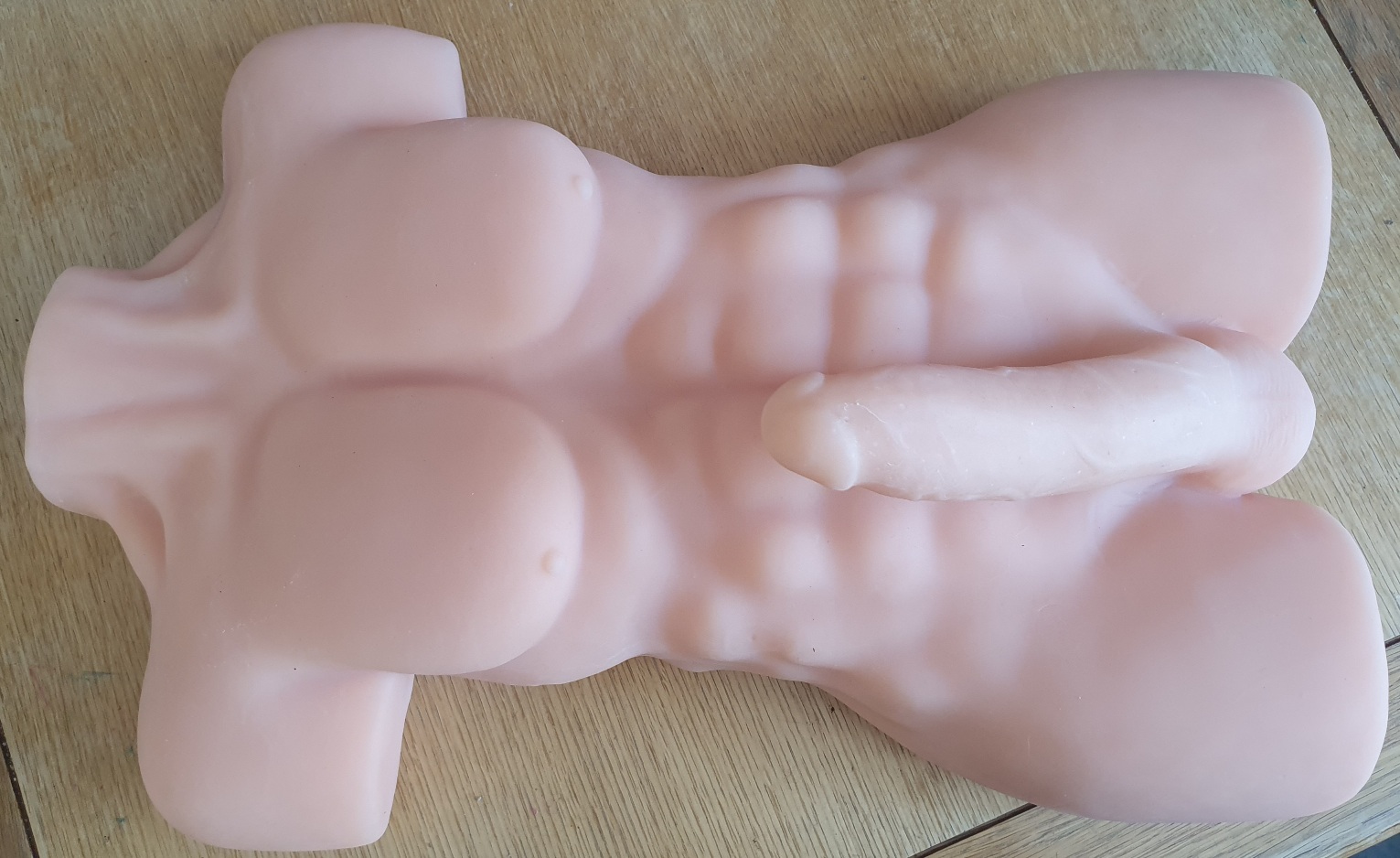 The dimensions are such that I can store him inside a small wheeled suitcase. He measures 39cm wide, by 58cm long. And when the penis is pressed in towards the body, the height is about 20cm. This doll is torso only, meaning there are no legs, arms or head. I’ll admit to being a bit concerned about this initially, but it has it’s benefits. Also, the torso is “ripped”, complete with defined pectorals and a ten pack to run your fingers over. Add to that the anus and rather impressive cock, and perhaps you have everything required for a hot and steamy session?
